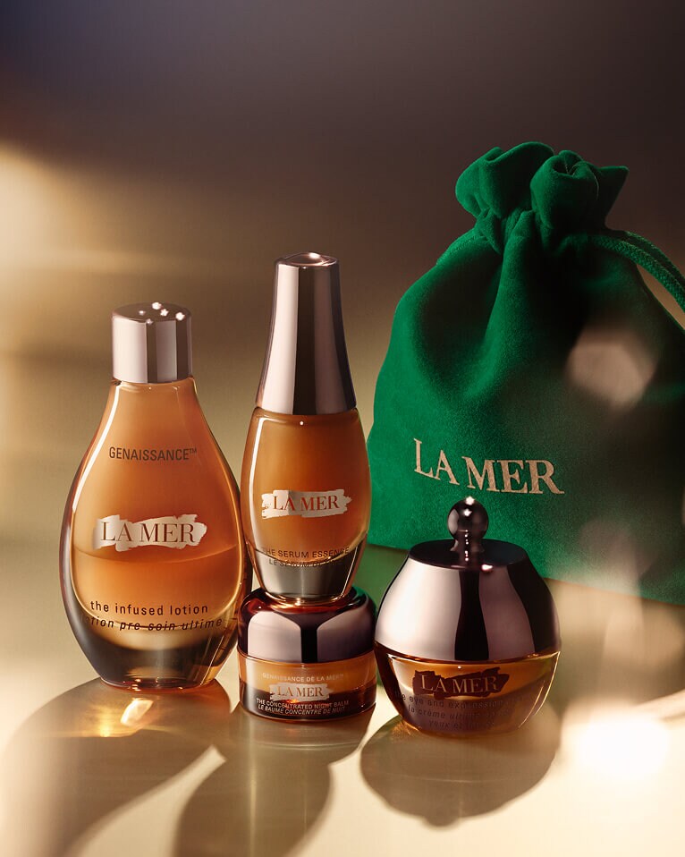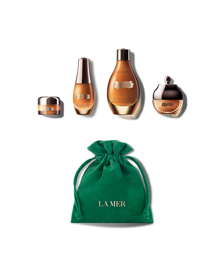 The Genaissance de la Mer Serum Essence 7ml The Genaissance de la Mer Infused Lotion 15ml The Genaissance de la Mer Eye & Expression Cream 5ml The Genaissance de la Mer Night Balm 3ml Signature Velveteen Pouch